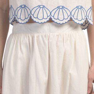2 piece set includes top and skirt, 2 side pockets on skirt, partially lined skirt, embroidered trim, scalloped detail