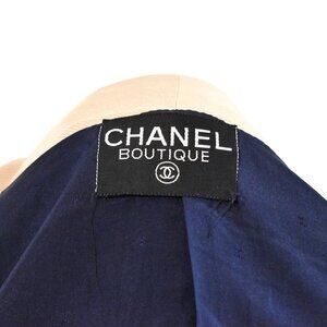 This stunning vintage Chanel two-piece set features a classic navy blazer paired with a matching skirt, accented by elegant cream trim and iconic gold-tone buttons. A true investment piece that embodies Chanel’s signature Parisian sophistication.