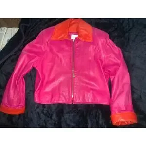 OUTSTANDING VINTAGE EIGHTIES GLOVE LEATHER JACKET FROM VAKKO IN HOT PINK WITH ORANGE COLLAR AND CUFFS. PINK LINING. SIZE SMALL, MEASUREMENTS IN PHOTOS. EXCELLENT CONDITION (very top of shoulders are just slightly faded hard to see even in person and doesn't show in photos)