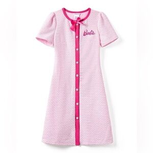 • Crafted in a soft, textured tweed, this dress features a flattering A-line silhouette with short puff sleeves, a button-front design with pearl-style buttons, and a bold hot-pink contrast trim for that unmistakable Barbie flair.