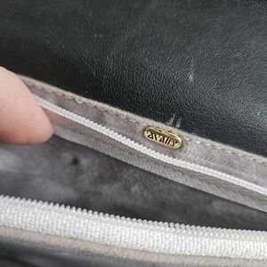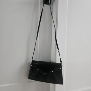 Elegant shoulder bag with sleek black design. Features striking purple accents. Perfect for any occasion.