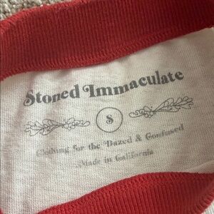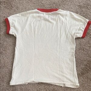 Retro-inspired tee with bold text. Red trim on sleeves and collar. Soft and comfortable fabric.