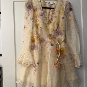 Charming cream midi dress with floral design. Features delicate purple and yellow flowers. Ideal for special occasions.