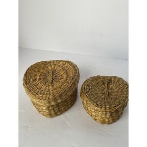 Small Vintage Sweetgrass Stacking Boho Wicker Trinket Box Baskets Lid Heart
