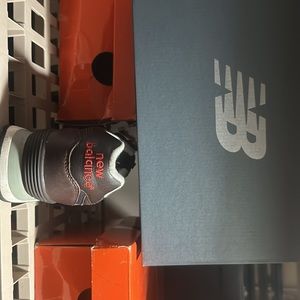 Sleek New Balance shoes with dark brown leather. Gray accents for a modern look. Perfect for athletic activities.