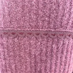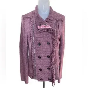 Chic mauve cardigan with double-breasted metal buttons lend a dash of military style to this cozy sweater. Features intricate trim and fringe. Ideal for layering