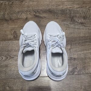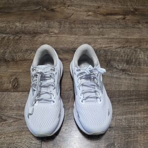Gently used Brooks Adrenaline GTS sneaker. Good condition and quality. Excellent comfort and support for daily wear or exercise. Sleek Brooks running shoes in white. Features a breathable mesh upper and secure lace-up closure. women's size 8 D wide