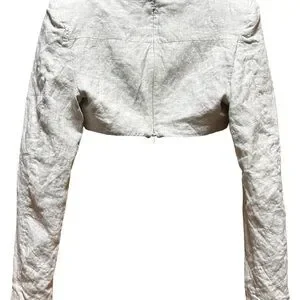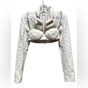 Statement-making Mistress Rocks cropped jacket featuring a structured corset-style bustier design in a soft ivory linen blend. Designed with underwire cups, ruched straps, and a fitted silhouette, this piece combines tailoring with a feminine edge. The long sleeves and zip-front closure add a modern, elevated feel, making it perfect for nights out, vacations, or styled with denim for a chic, fashion-forward look.