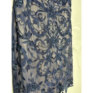 This stunning Sue Wong cocktail dress features a beautiful blue color with floral embroidery and beaded accents. The dress has a scoop neckline and is sleeveless, making it perfect for a formal occasion such as a wedding or cocktail party. The knee-length sheath style dress is made of polyester and nylon chiffon fabric, and has a zip closure.