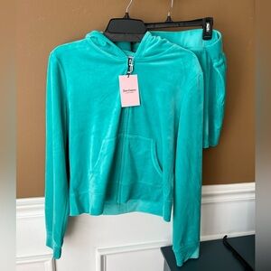 Chic velour set by Juicy Couture. Features a hoodie and shorts in coastal teal.