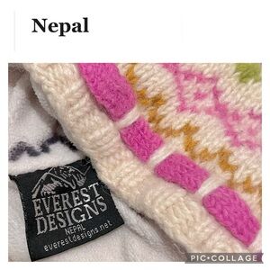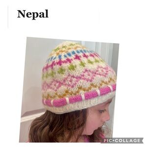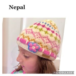 EVEREST DESIGNS GIRLS WOOL KNIT BEANIE RAISED PINK FLOWER FAIR ISLE