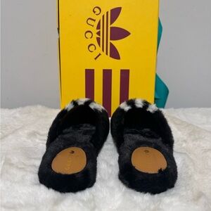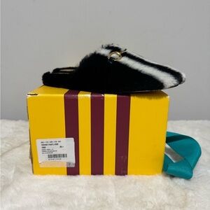 Luxurious Gucci slippers with bold black and white stripes. Soft fur design for ultimate comfort.