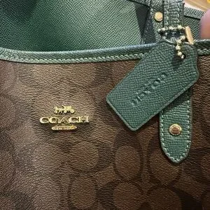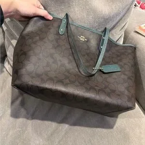 Coach tote with dark brown signature pattern and green leather interior