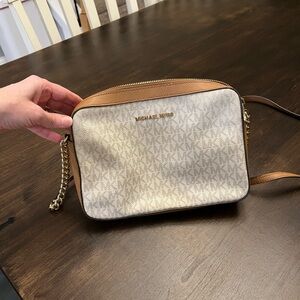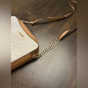 Stylish Michael Kors crossbody. Features tan and cream design. Perfect for any outfit. Adjustable strap for comfort. Last 3 pics show some very minor imperfections. Overall looks great!