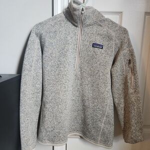 Cozy gray women's quarter-zip fleece pullover by Patagonia. Features a zippered arm pocket. 100% recycled polyester.