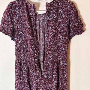 A charming J. Crew midi dress in a rich burgundy hue adorned with a delicate floral print. This dress features a flattering round neckline with subtle gathering at the bust and short puff sleeves. The tiered skirt with a ruffled hem adds a touch of whimsical movement. Perfect for a casual day out, a summer picnic, or a relaxed brunch.