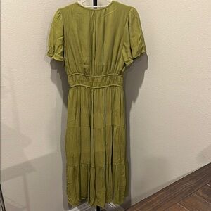 This green sundress features a scoop neckline and charming puff sleeves, perfect for casual or work settings. The pleated design adds a touch of elegance, while the buttoned front enhances its classic appeal. Its midi length offers a versatile and stylish look for any occasion.