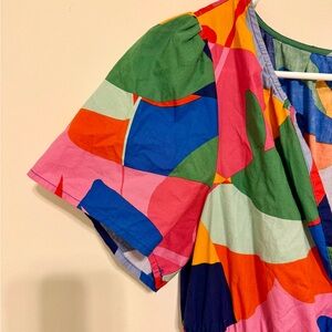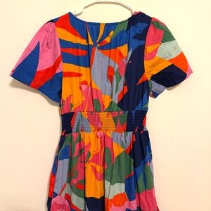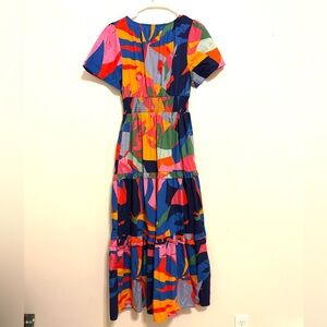 SugarLips dress, SugarLips midi dress, SugarLips multicolor dress, abstract print dress, colorblock dress, bold print dress, statement dress, artsy dress, modern boho dress, bohemian midi dress, contemporary dress, V neck dress, short sleeve dress, smocked waist dress, elastic waist dress, tiered skirt dress, flowy midi dress, cotton midi dress, lightweight cotton dress, navy dress, blue dress, pink dress, green dress, yellow dress, orange dress, multicolor dress, spring dress, summer dress, fall transition dress, vacation dress, brunch dress, casual chic dress, daytime dress, weekend outfit, travel outfit, women’s medium dress, size M dress