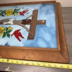Vintage hand-painted glass folk art depicting Jesus Christ on the cross, dated 1977 and identified on the back as having been painted by an inmate at Attica Prison.