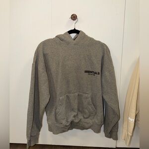 Heather gray hoodie with black Essentials logo on back. Classic Fear of God style.