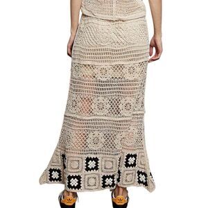 Elevate your summer wardrobe with this beautiful, handcrafted-style crochet maxi skirt. This skirt features a sophisticated intricate open-knit patterns and a striking black and white "granny square" patchwork border at the hem. It’s the perfect blend of 70s vintage nostalgia and modern bohemian elegance.