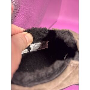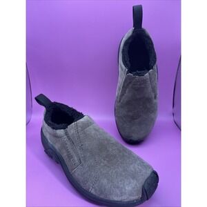 The Merrell Women's Jungle Moc Slip-On Brown Suede Hiking Shoes in size 5.5 are a stylish and durable option for outdoor activities. Featuring a solid brown color with a round toe shape, these shoes are easy to slip on and off. Made with leather upper material and accented with faux fur trim and the Merrell logo, they are perfect for travel, activewear, and casual occasions. The slip-on style and comfortable flat design make them ideal for hiking and other outdoor adventures in the winter, fall, and spring seasons.