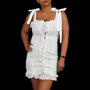 White Corset Dress Lace Up Bodice Mini Ruffle Cotton Embroidery Lace Size Medium
