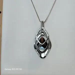 This stunning silver pendant necklace features a 3-tier design with intricate details. Features three graduated diamond shaped pendants with the largest having a multifaceted, shiny and reflective stone.