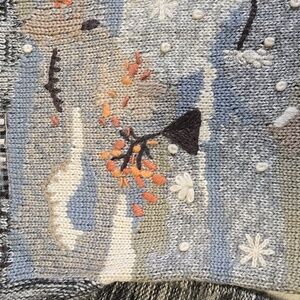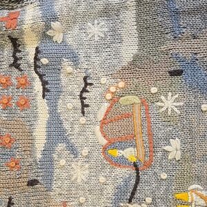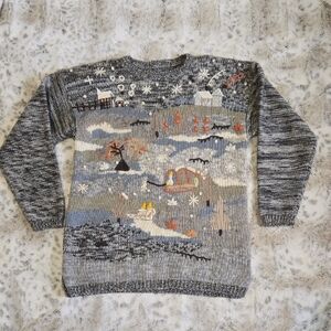 Vintage embroidered crewneck sweater. Winter graphics on the front. 70% acrylic, 30% wool. Size tag removed, estimated size medium based on measurements. Pit to pit approx 20in. Length approx 26in.