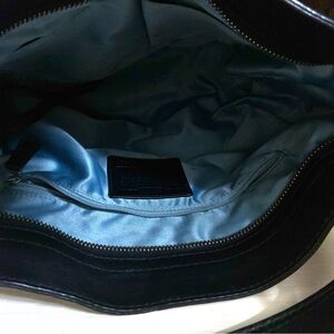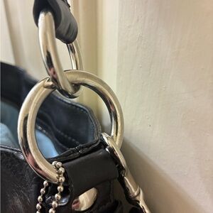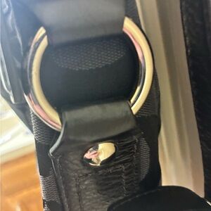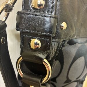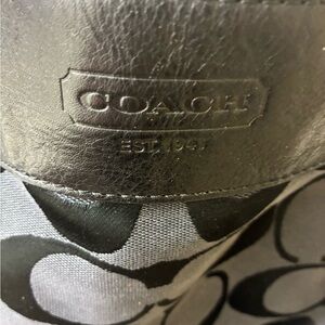 Stylish Coach shoulder bag with signature pattern. Features black leather accents and silver hardware. Perfect for everyday use
