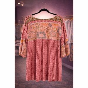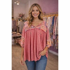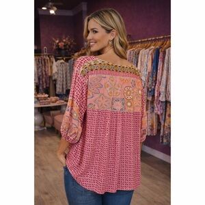 Boho Pink Print V Neck 3/4 Sleeve Tie Front Top!