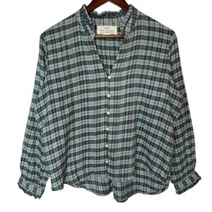 Trovata Birds of Paradis Finley Pintuck Blouse Top in Bluebird Plaid Medium