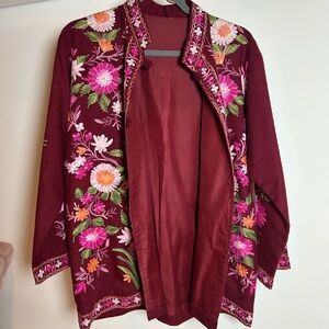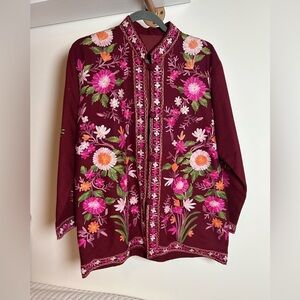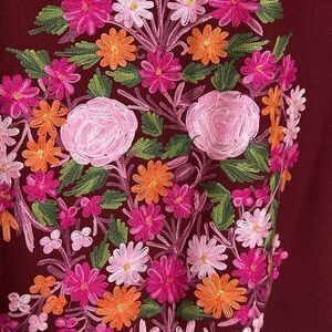 Elegant women's top featuring vibrant floral embroidery on a rich maroon background. Perfect for adding a touch of color to your wardrobe.