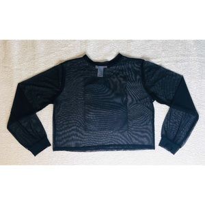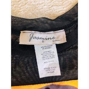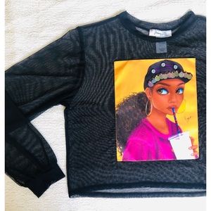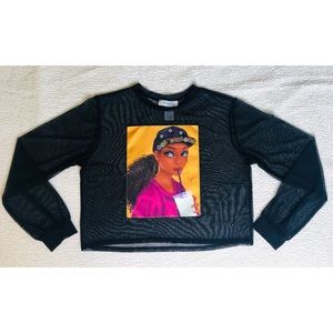 Semi-sheer black mesh top with multicolor design.