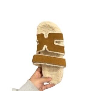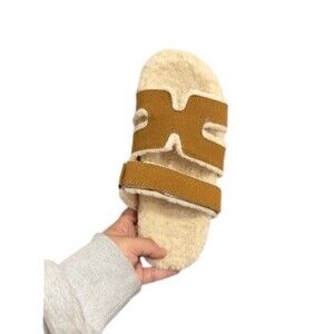 These slide sandals are the kind you’ll reach for nonstop—camel brown. H strap on top, plush faux-fur lining underfoot, and a flat profile that feels easy all day. Rubber outsole with textured tread adds grip. Perfect for casual days, travel, lounging, or elevated athleisure. Condition: new_in_box.