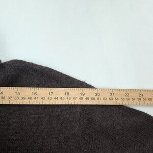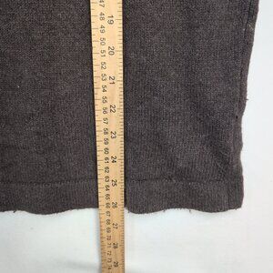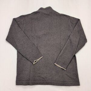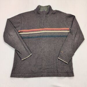 Columbia men's half-zip sweater in size L. Charcoal gray knit with multicolor horizontal stripe across the chest, ribbed mock collar, cuffs, and hem, plus a short zip placket for easy layering. Excellent used condition with normal light wear. Quality notes: a couple of very small spots, the largest located at the waist hem (pictured). No major rips, tears, or flaws.