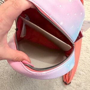 Pack your essentials into a magical mini backpack! This Sanrio bag features a whimsical galaxy of stars, bows and hearts, with Hello Kitty and Tiny Chum posing together in a sweet outfit. Comes with front zipper pocket, interior drop pocket, adjustable straps and top carrying handle.