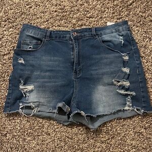 Trendy dark blue jean shorts with distressed details. Ideal for casual wear.