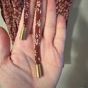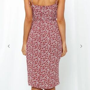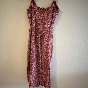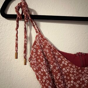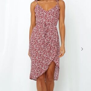 Hello Molly floral dress with asymmetrical bottom. Cute little gold tie accents on the straps and around the waist.