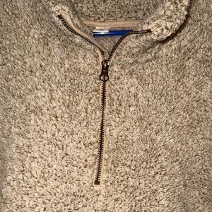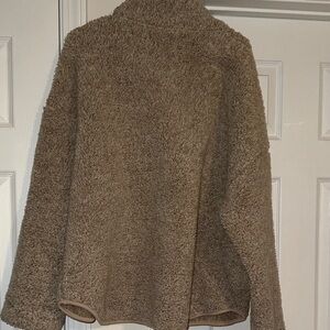 Warm and soft tan sherpa pullover. Features a half-zip design.