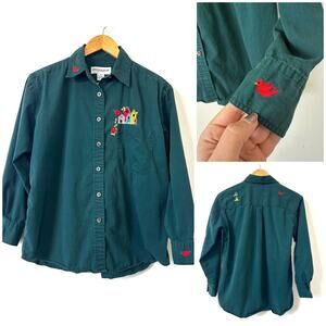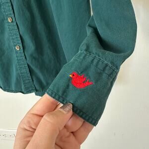 VTG 90s Embroidered Birds Button Up Shirt Birdhouse Green S Cottage Whimsical