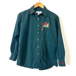 Keywords: vintage embroidered shirt, birdhouse embroidery, novelty button up, 90s vintage top, nature motif shirt, cotton button down