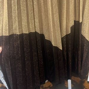 This stunning midi dress by Free People features a pleated design in a striking two-tone color scheme of gold and brown, perfect for cocktail or night out occasions. The sleeveless halter neckline adds a touch of elegance. Labeled a small but will fit up to a medium.