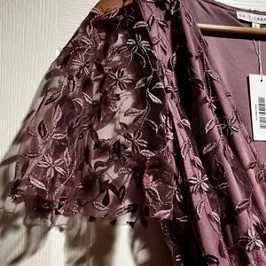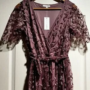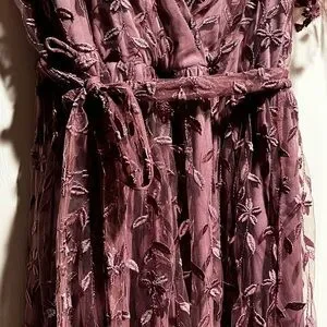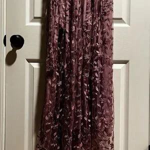 Chic mauve maxi dress with floral embroidery. Features a flattering V-neck and short sleeves. Ideal for elegant occasions.