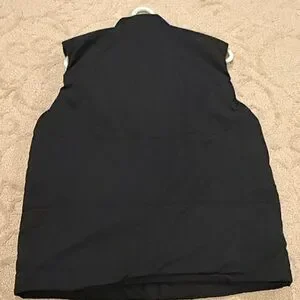 Sleek black puffer vest with zip pockets. Ideal for layering. Modern and versatile design.