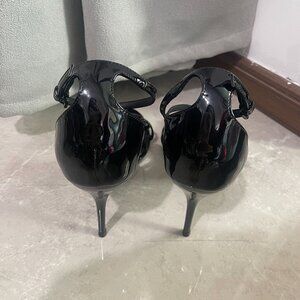 Multi-strap sandals with a stacked stiletto heel, decorated with the cassandre and featuring an adjustable ankle strap.
