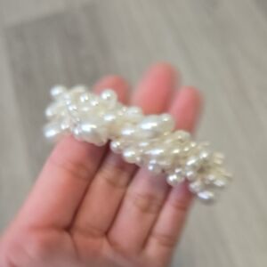 Chic hair scrunchie adorned with elegant pearl beads. Perfect for adding a touch of sophistication to any hairstyle.
