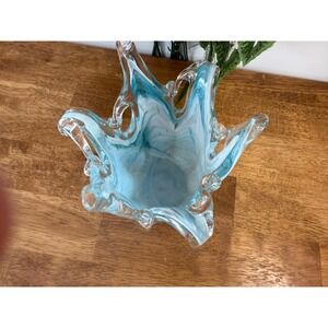 Vintage Hand Blown Blue White Art Glass Ruffled Vase Sculptural Studio Glass