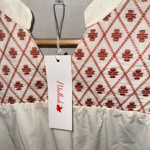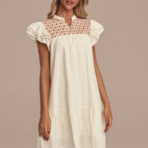 Crafted in a soft, neutral oat hue, this dress offers a natural and effortless look. The delicate embroidery adds intricate detail, enhancing its feminine appeal. Featuring a flattering V-neckline and breezy short sleeves, it provides both style and comfort.