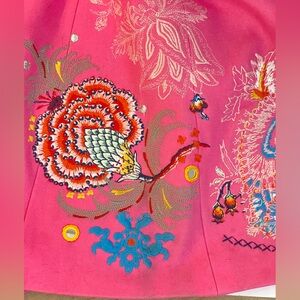 This is a Oilily pink floral and paisely emboridery coat in size 40. It has embroidery along the hem and sleeves. This is a tailored fitted silhouette with snap button down closure. Preowned with surface rubbing along the cuffs and the bottom as well as the seam but still in great condition. Shoulder 15.5" chest 36" length 45" sleeves 25.5"